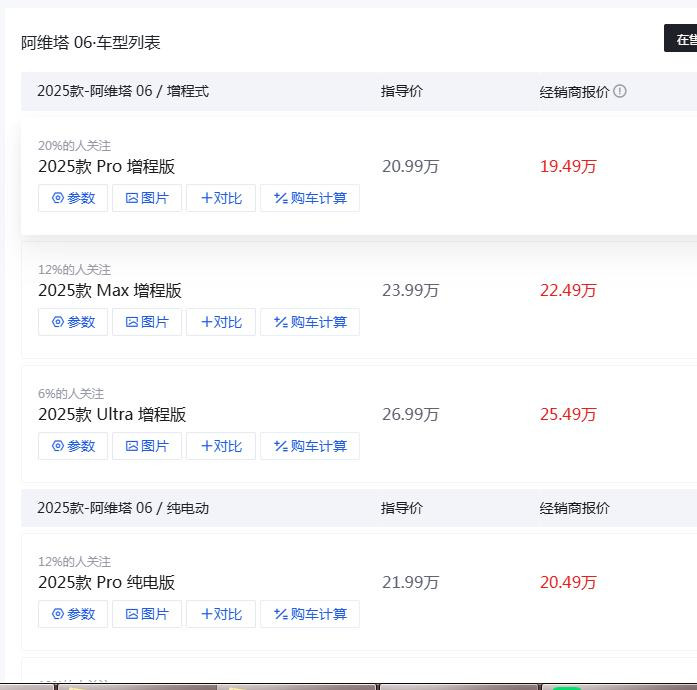 阿维塔06 的版本划分很明确,纯电和增程各有 Pro、Max、Ultra 三个版本,差价都在 3 万左右,咱们按预算和需求来选:
